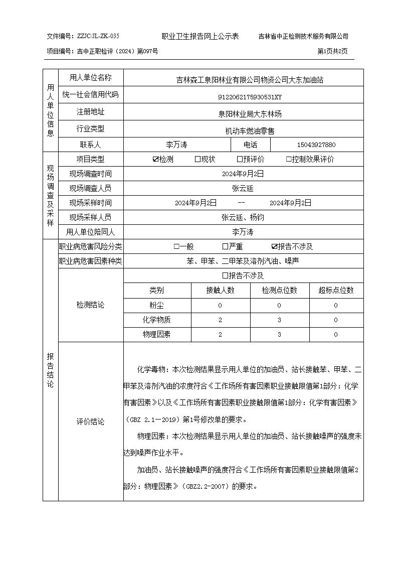 2024检测097_吉林森工泉阳林业有限公司物资公司大东加油站