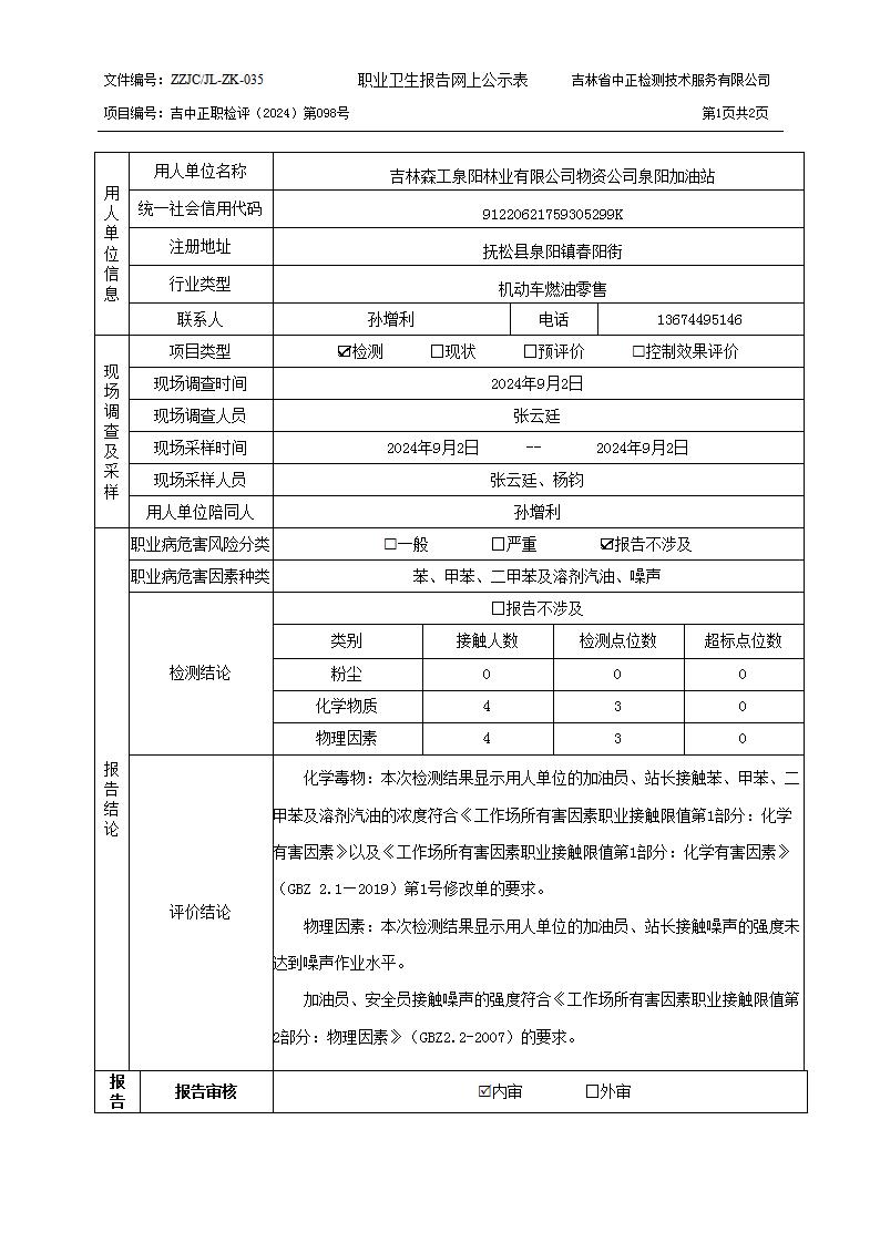 2024检测098_吉林森工泉阳林业有限公司物资公司泉阳加油站